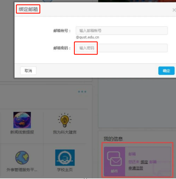 邮箱专用密码(不是邮箱的登录密码)主要应用于“智慧青科大”绑定校园邮箱(如下图)操作时,