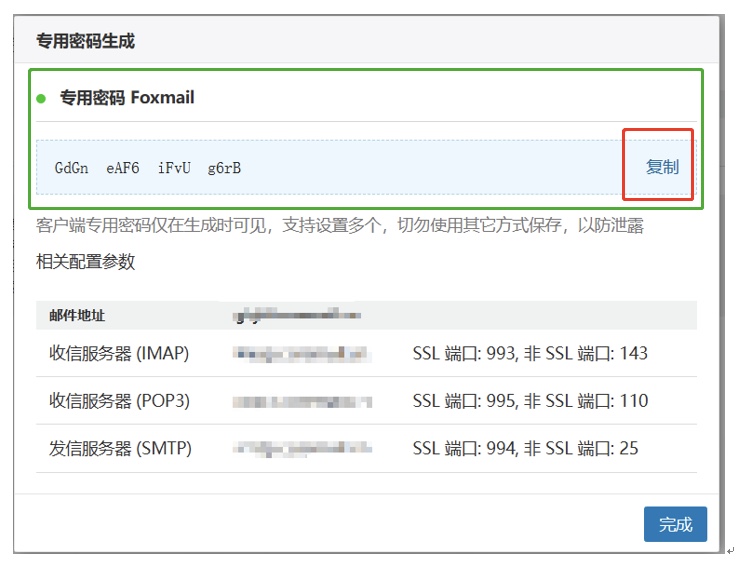4.设置完成,系统自动生成一个16位随机字符串的专用密码(如下图):
