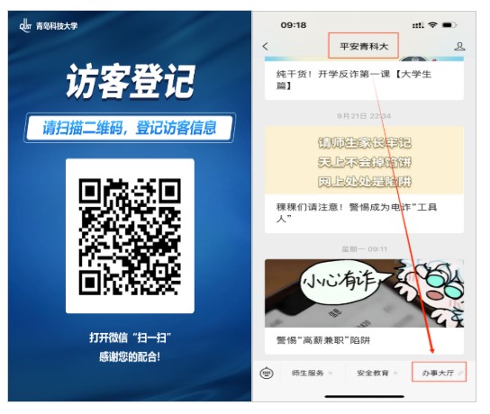 访客预约功能合并至安管处访客预约系统。访客需扫描学校“访客登记二维码”进行预约,或关注“平安青科大”微信公众号,点击“办事大厅”进行预约,教职工也可从该系统代为预约。